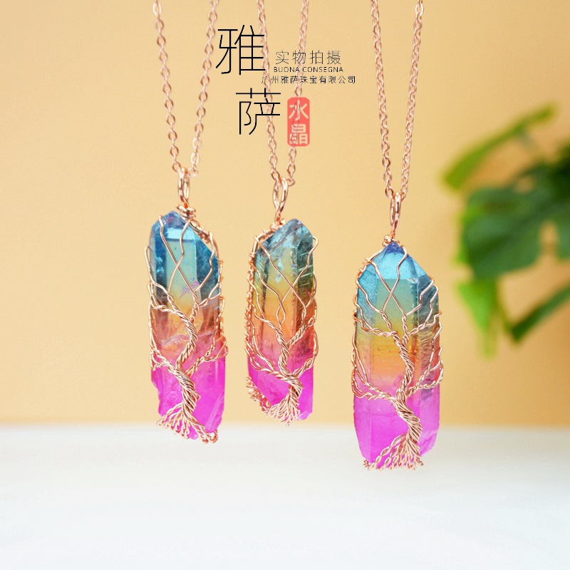 新商品の速売通の商品のソースは手で線の七色の水晶の石のネックレスの水晶の柱の知恵の木のネックレスの卸売りを巻きます。