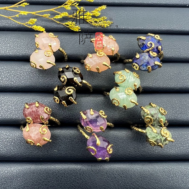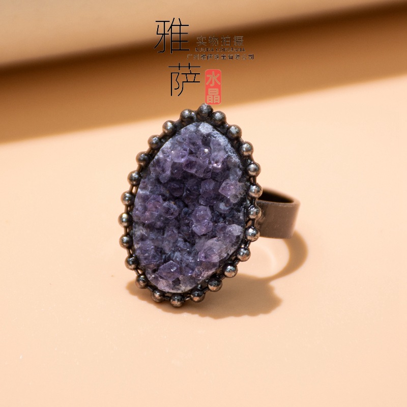 新品天然水晶牙瑪瑙晶芽指輪結晶クラスター紫晶洞調節可能なオープンリング