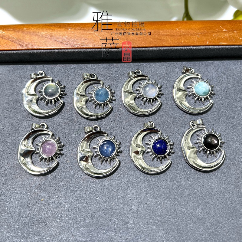 天然水晶青い月の光ペンダントファッション古銀色の三日月の金の青い金の海の波紋の水晶のペンダントの卸売り