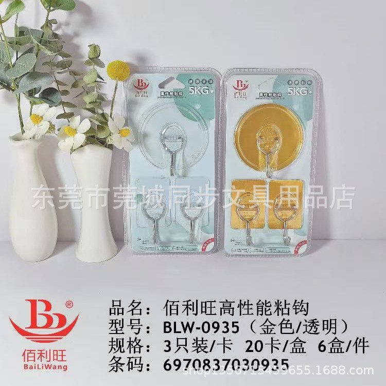 Bailiwang 0935 (3 個/カード) 透明ゴールドの釘不要粘着フック (耐荷重 5KG)