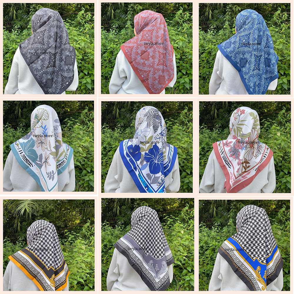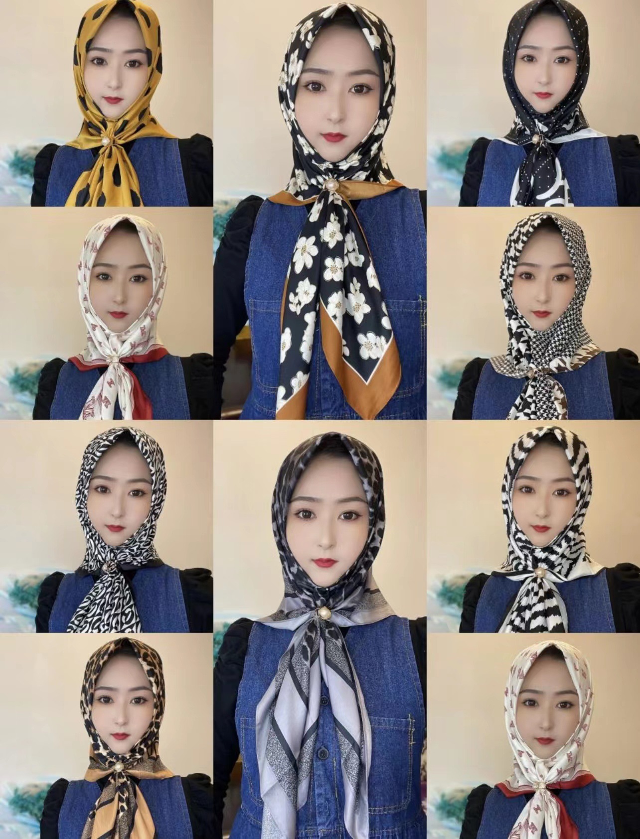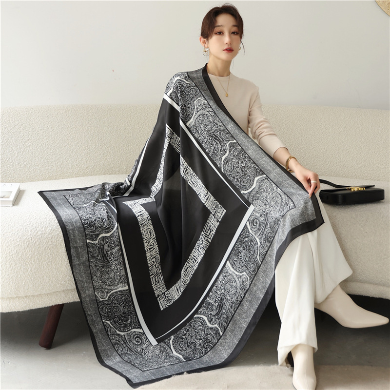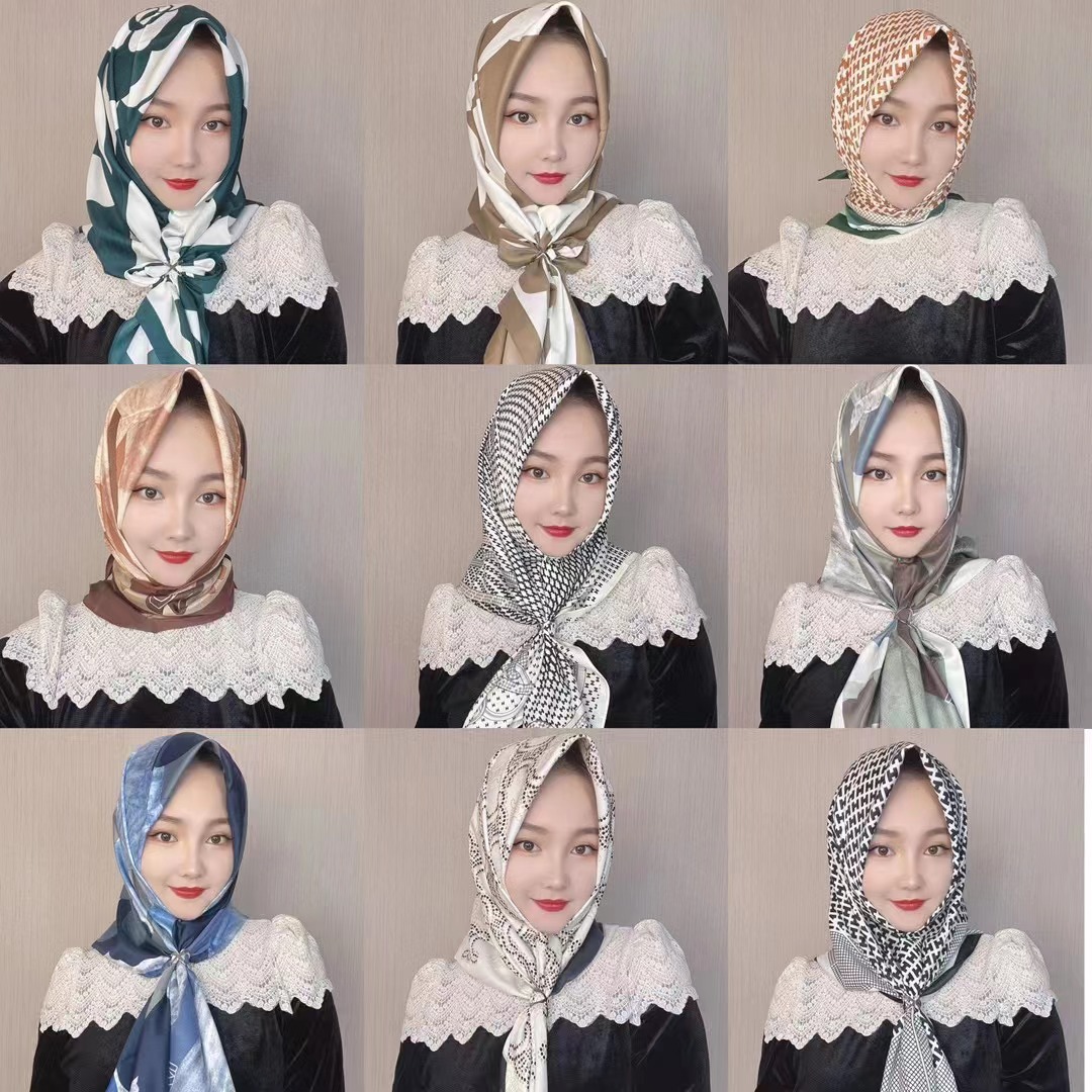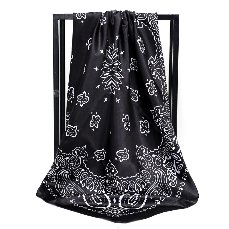 白黒シンプル90cm大角巾サテン色丁女性マフラーマレーシア復古頭巾対外貿易scf