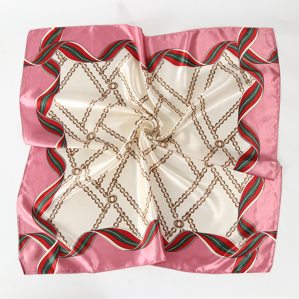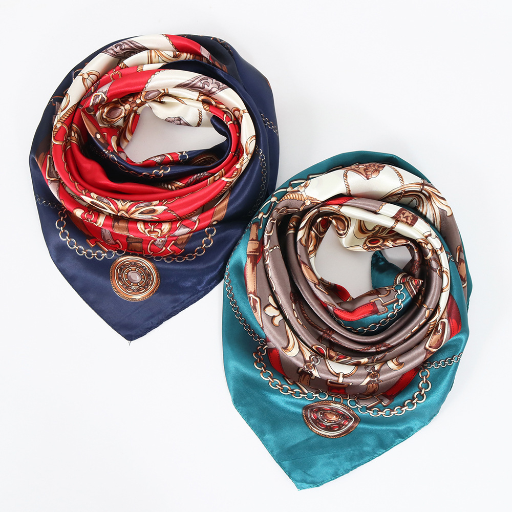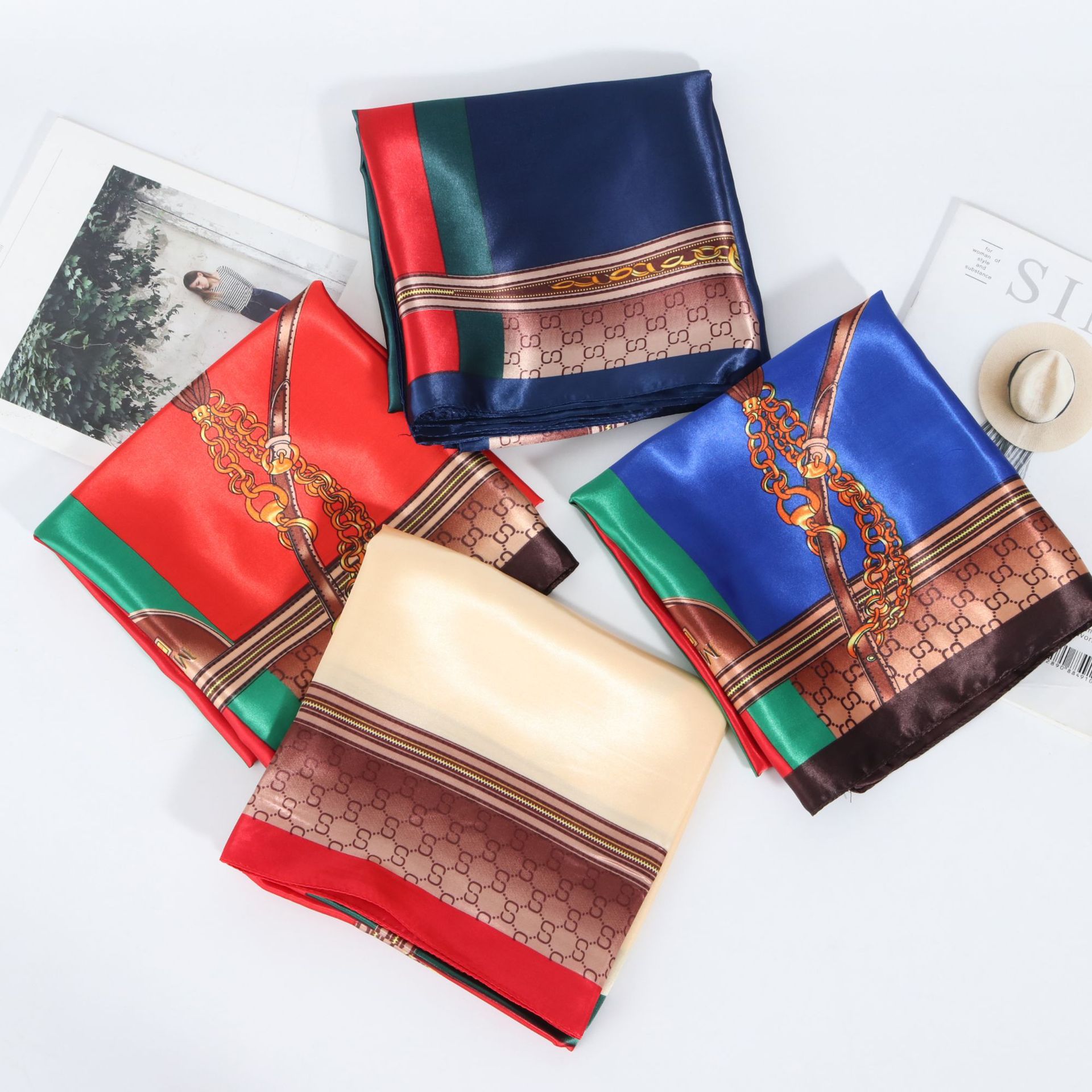 Tiktokネットの赤いガーゼのサテンの色のシルクのタオルの90cmの大きい方のタオルのファッションのショールのチェーンのプリントの越境の商品の供給源