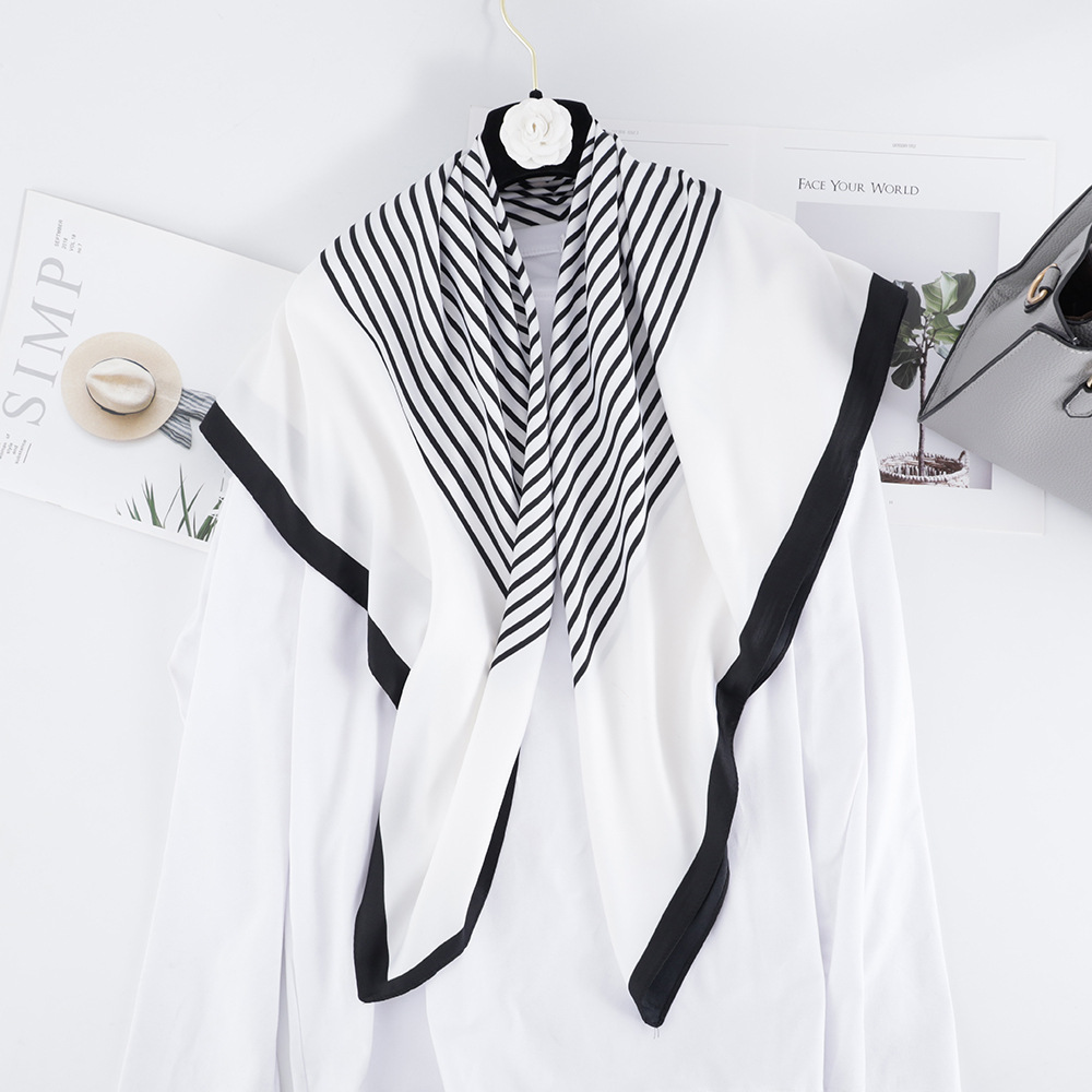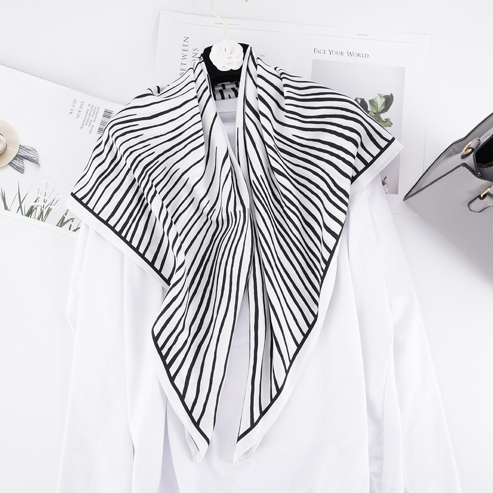 黒と白のストライプのプリントのシルクタオルのツイルのシミュレーションのシルクタオルの90cmの大きい方のタオルの職業の服装は日よけのストールを飾ります。
