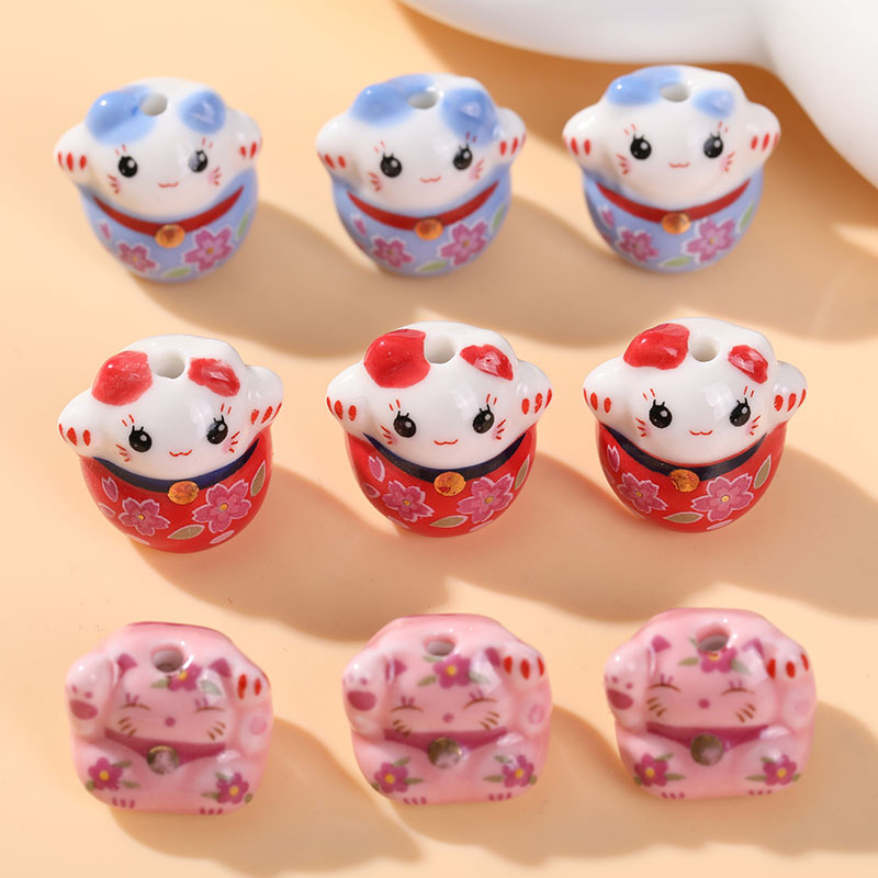 国風かわいいアニメ招き猫猫陶磁器珠diy手作ビーズイヤリング髪飾りブレスレット材料卸売り