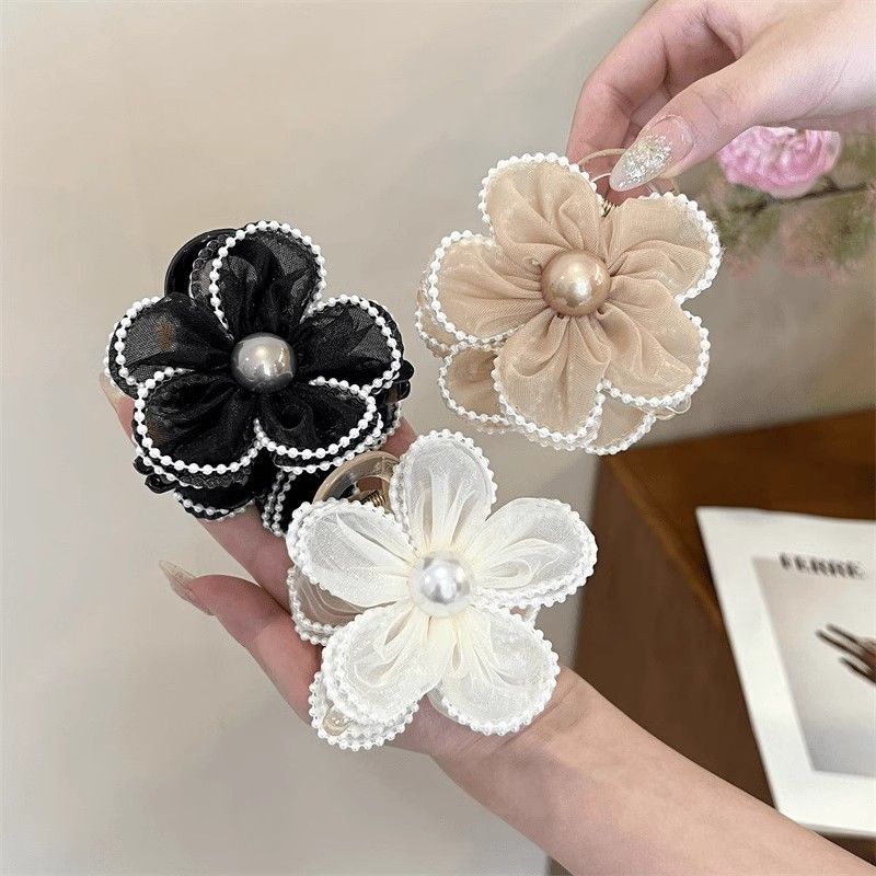 網糸真珠掴み女2024新髪量が少ないサメがトランペットのヘアピンを挟んで高級感のある花のヘアピンが飾られている