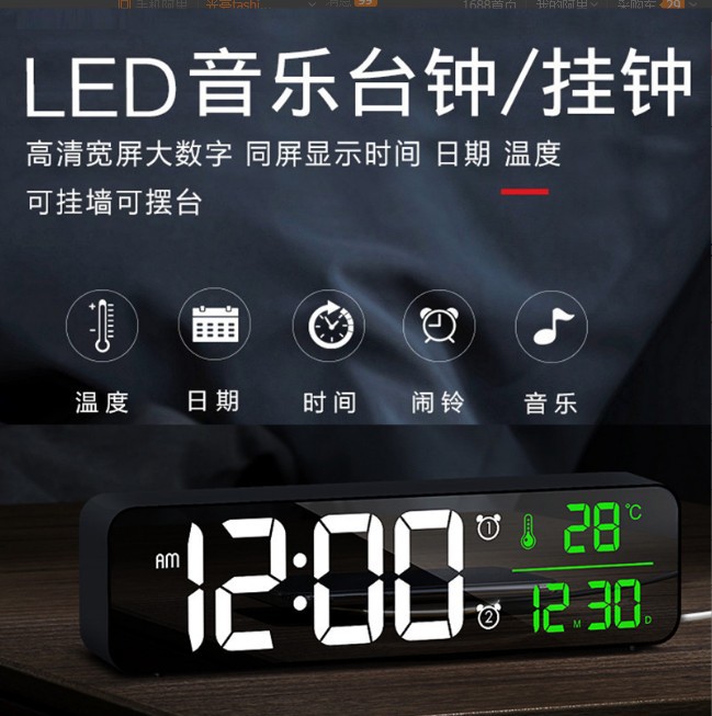 大画面ledデジタル時計日付温度プラグイン音楽ベルリビングルームオフィステーブル吊り下げ式発光テーブル