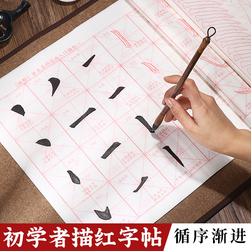 初心者の宣紙の書道は紅の練習紙をなぞって入門します。