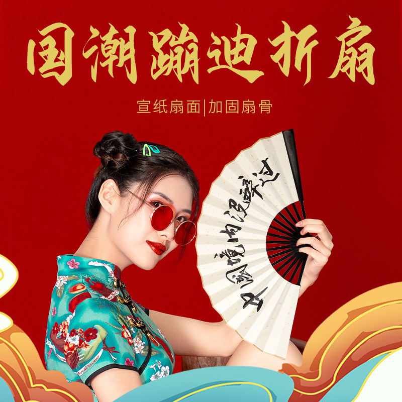 金榜振音十寸バートランポリン扇子ネット赤古風折扇絹布ネット紅扇潮語白地国潮