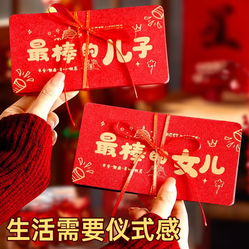 成人式の最高の息子の娘が赤いバッグを折った新しいアイデアカードの儀式のストレッチは閉鎖されている