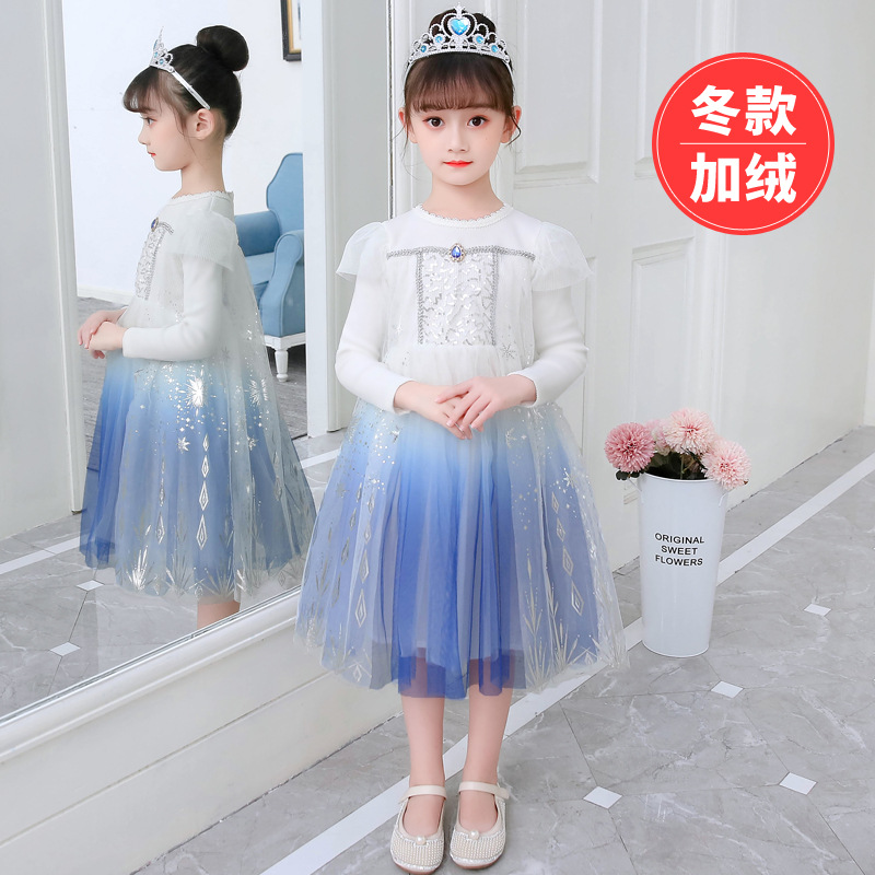 艾莎お姫様のスカートの子供の秋冬のベルベットの氷雪の奇縁の愛莎の女の子のワンピースの演出服は代行します。