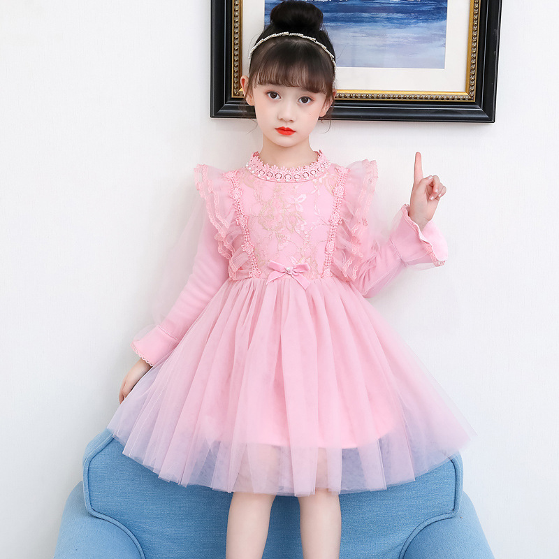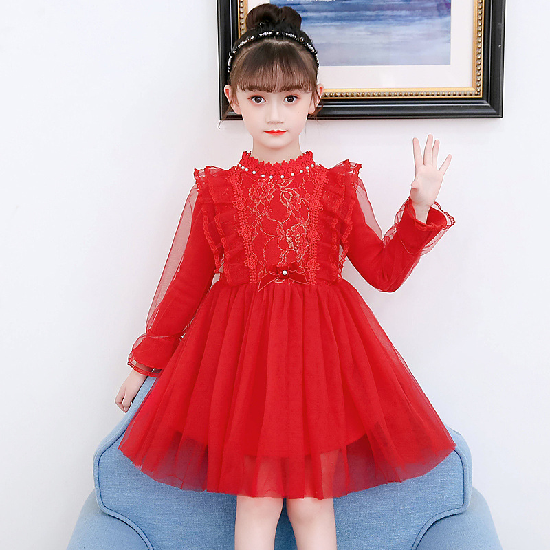 女の子プリンセスドレス新作春秋長袖レース洋風ワンピース子供用レッドショー新年ドレスガーゼドレス