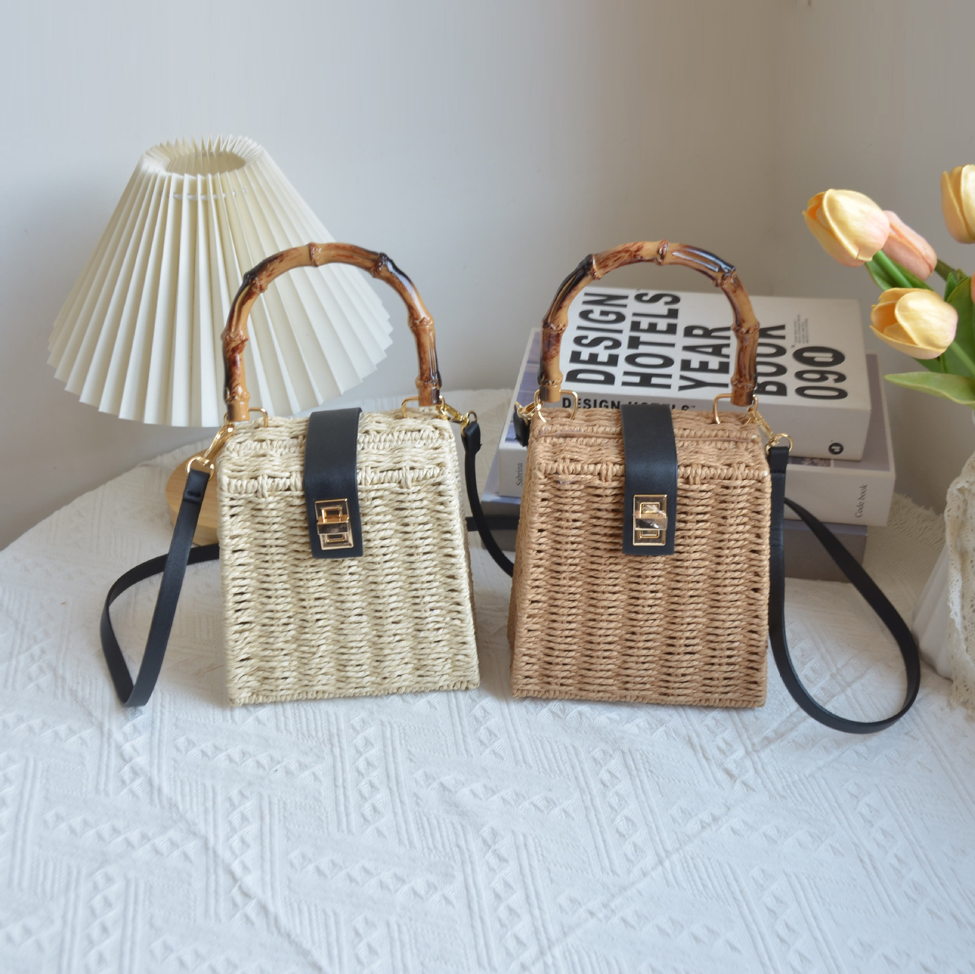 新商品高級感レトロ台形ハンドバッグ片肩斜めバッグ竹節手作り草編みバッグ工場直売