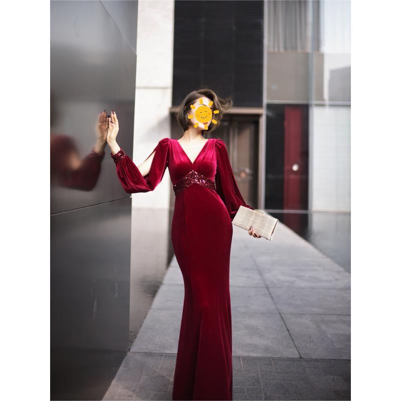 フレンチスタイルのドレス女性2024新型セクシーなスパンコールの尾のスカートの司会者の高級なデザイン感のある首のワンピース