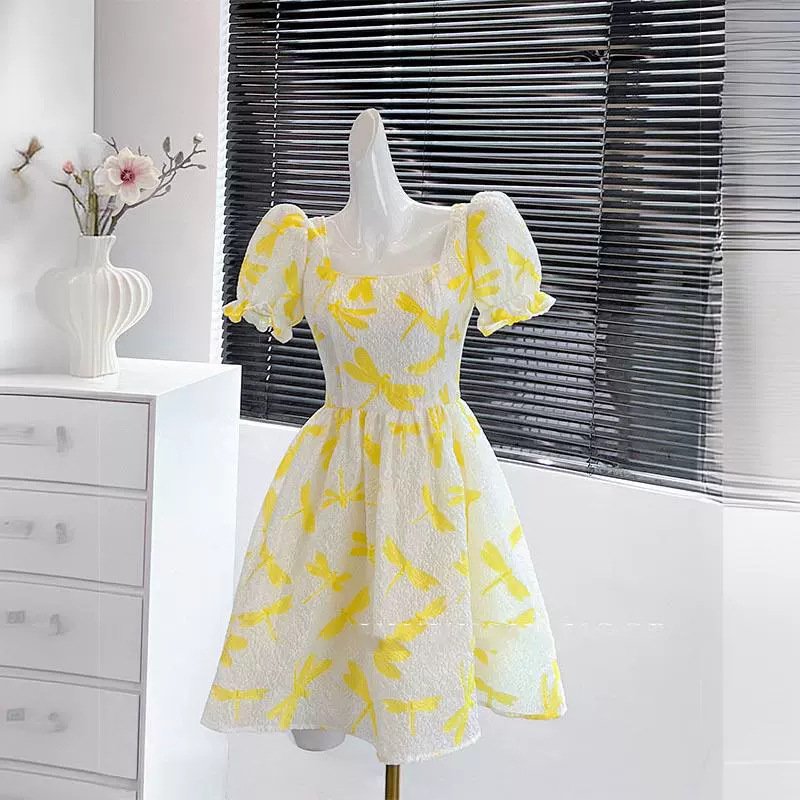 黄色のレトロな方襟半袖ワンピース女性夏のロングスカートのデザイン感が小さい小柄な高級ドレススカート