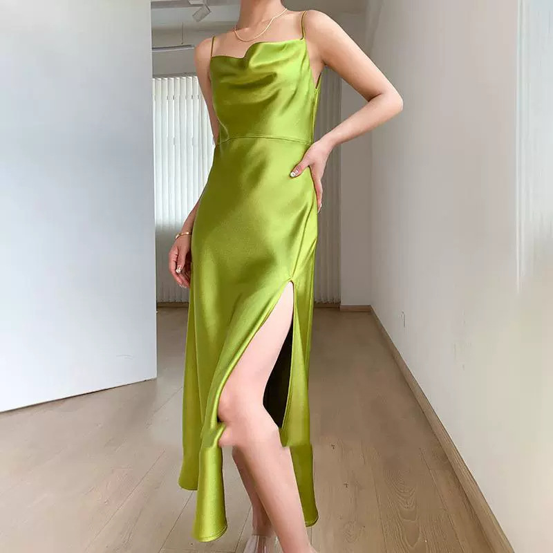 緑のストラップのドレスのワンピースの2024の新型の斜めの裁断の襟の長いスカートの高開のフォークのセクシーな宴会の朝のガウンのドレス