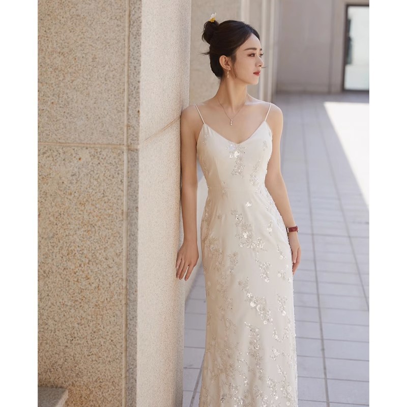 白いフレンチスタイルのイブニングドレス2025新作夏用キャミソールセクシーな欧米風ワンピース気質のある日常宴会用イブニングドレス