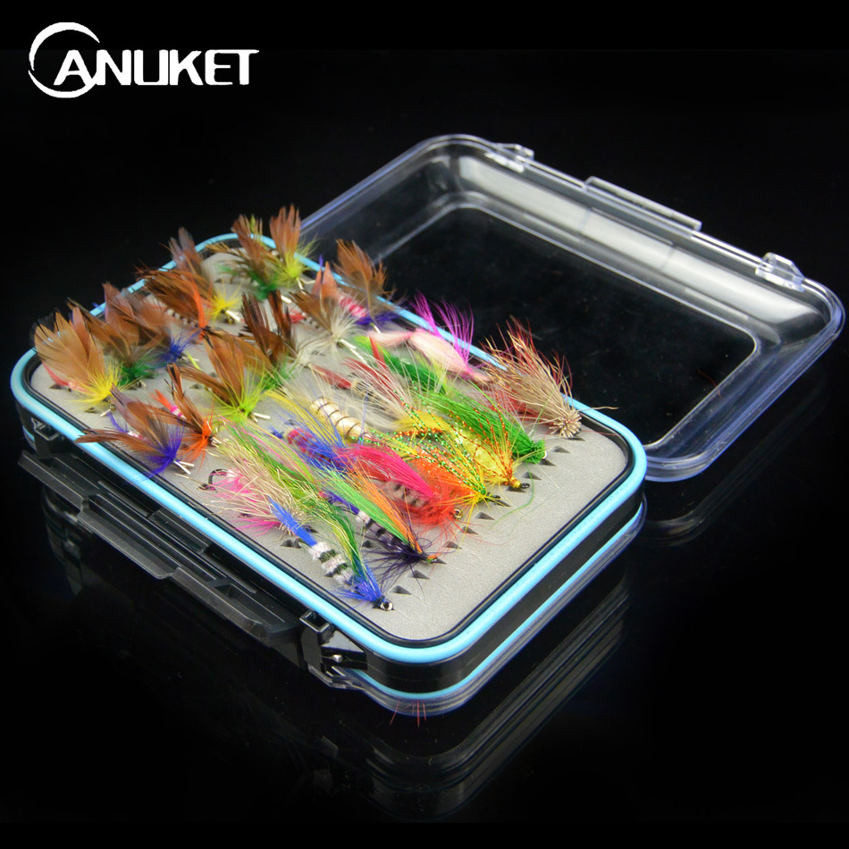 クロスボーダー64pcsフライハエフック箱入りセット屋外透明水漁箱釣り箱偽餌釣り漁具