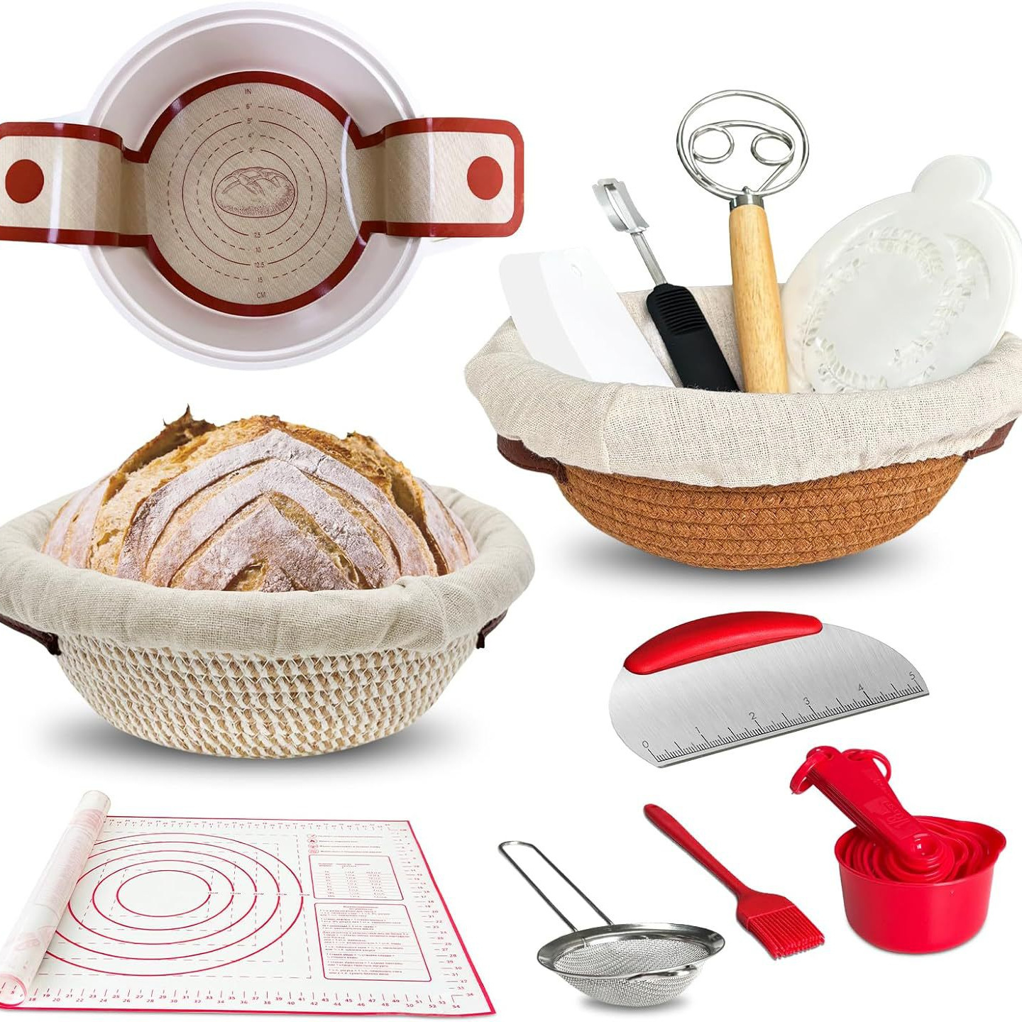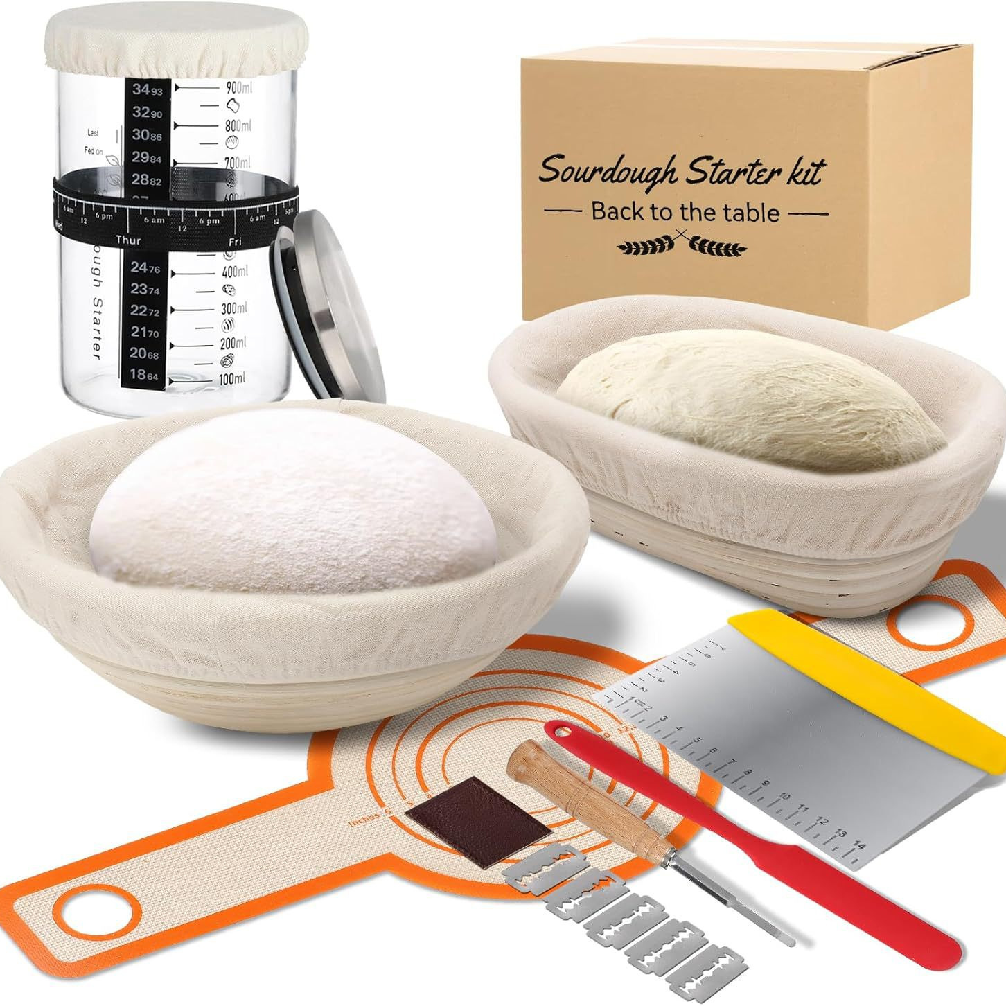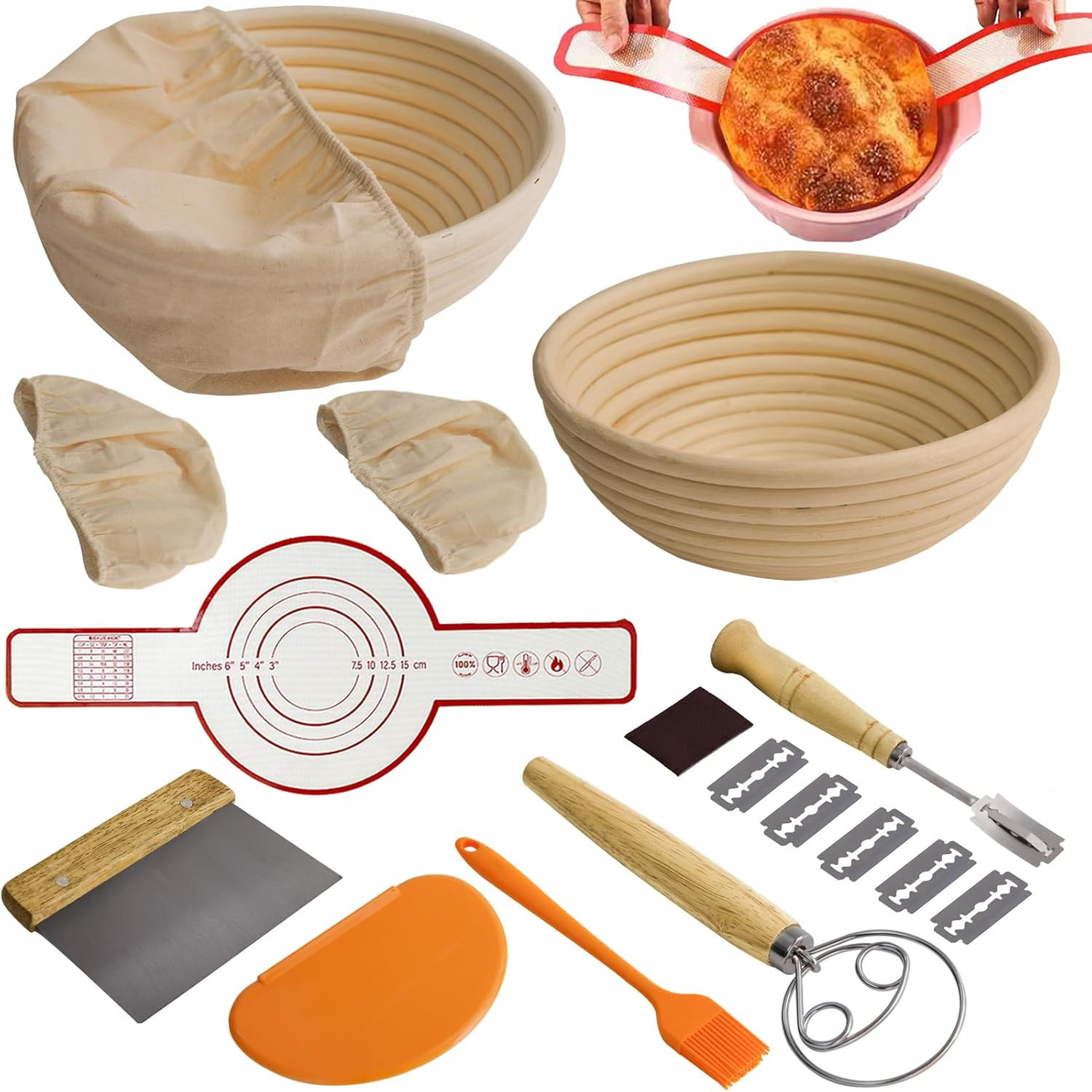 Amazon 13点セット 9inch 10inch ヨーロピアン発酵バスケット 天然籐発酵バスケット 発酵ガラス瓶 スクレーパー