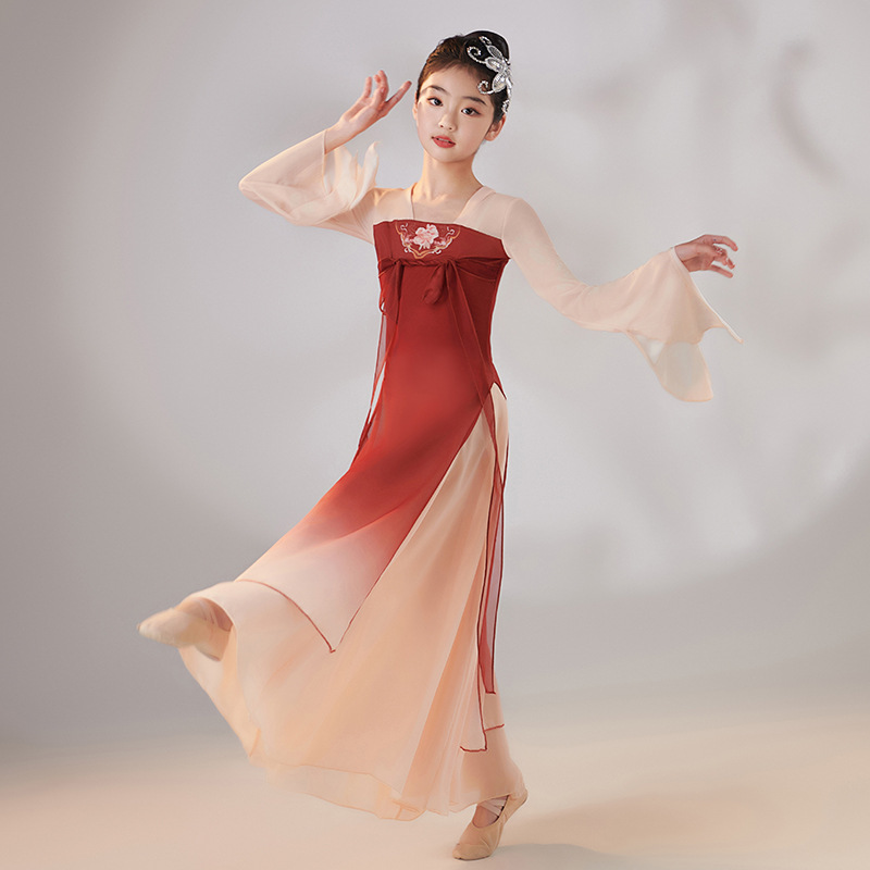 子供の古典舞踊のパフォーマンス服、エレガントなガーゼの女の子の漢と唐の胸までの長さのリボンダンスの服、中国のダンススーツ