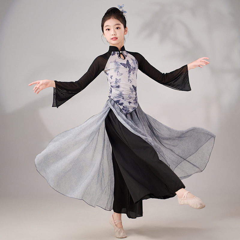 子供の古典的なダンスパフォーマンス服スカートプリント女の子服中国舞踊練習パフォーマンス服セットエレガントなガーゼ服