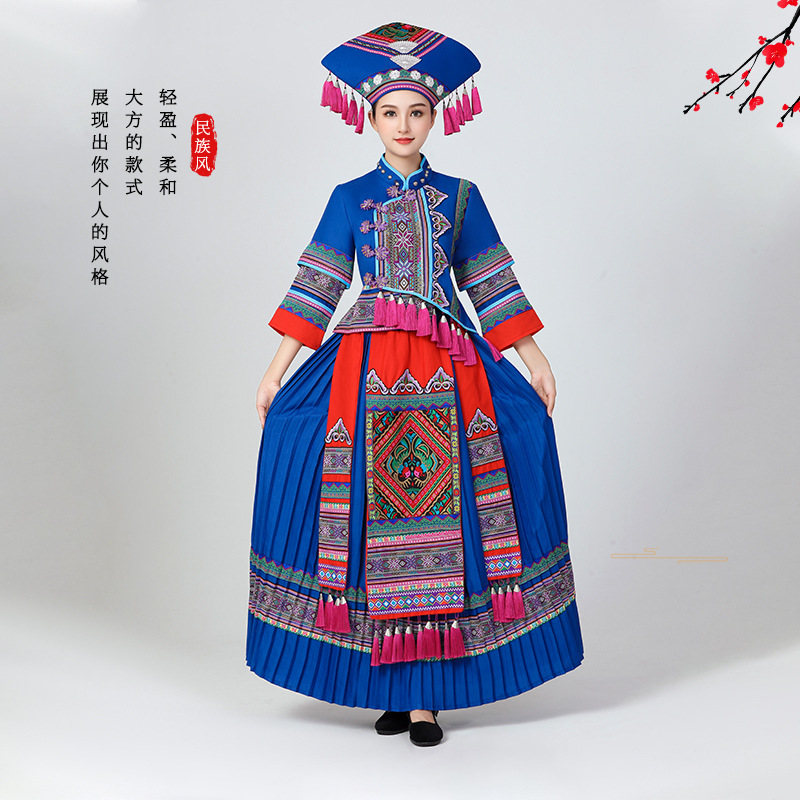 新商品の成人女性ハニ族の公演服56人の名族の女性の少数民族の合唱服の舞台の演技の服装