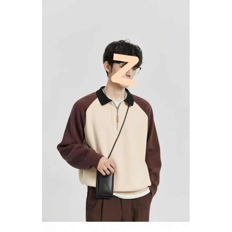 Poloシャツ男2024秋新作レトロ学院風半開襟ニットセーターファッション衝突色肩袖