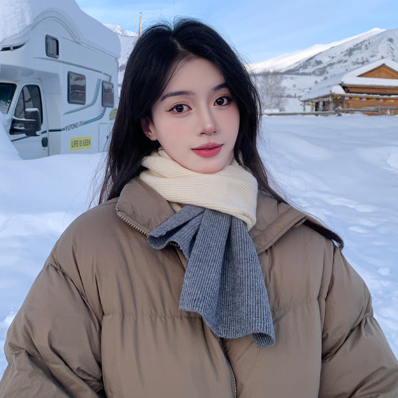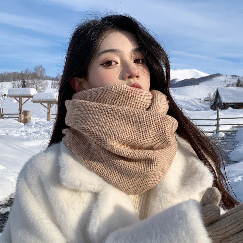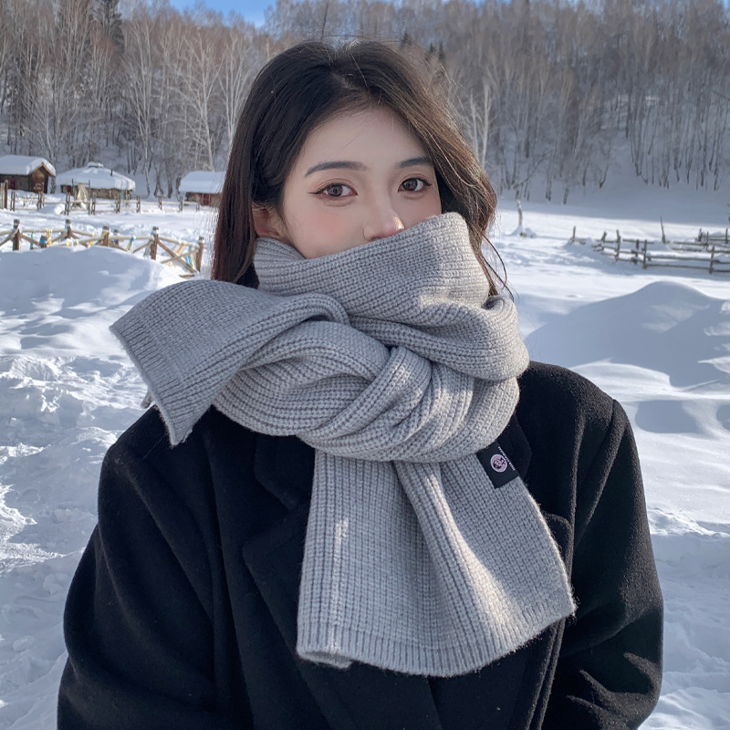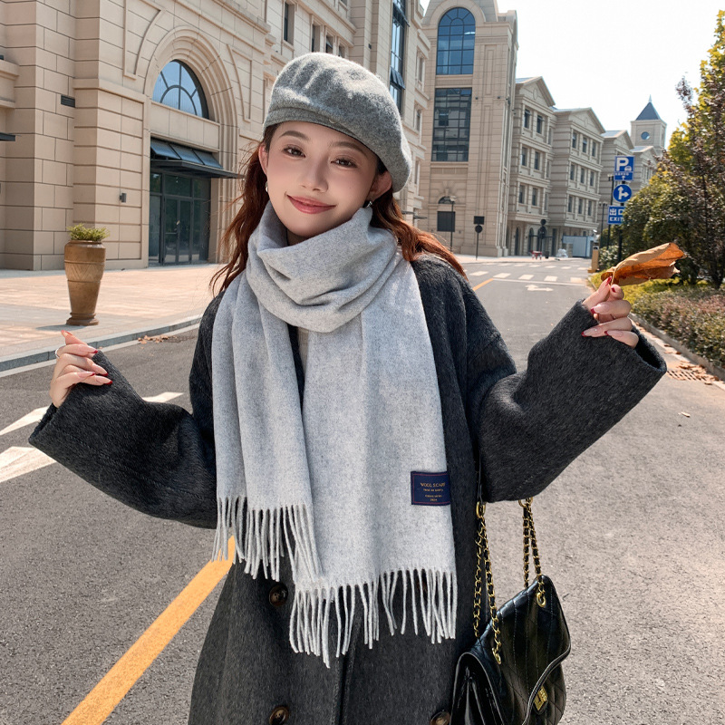 韓国版は純色のマフラーを合わせています。女性は冬に高品質で毛糸を厚くしています。