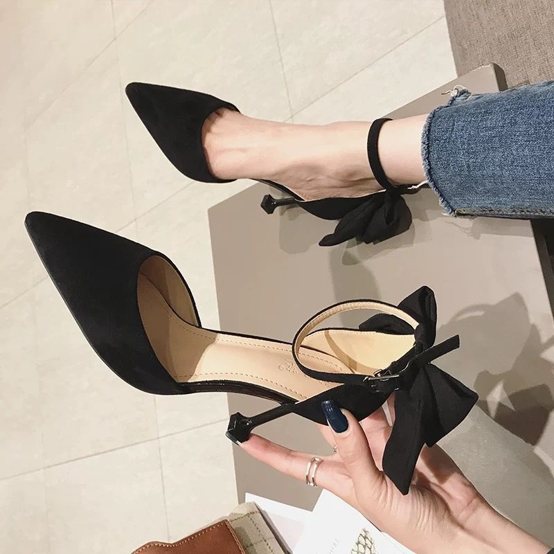 ハイヒールの女性2024年の新型ネットレッド2024は先のセクシーな細いとフランスの少女の黒い一字の帯を合わせます。