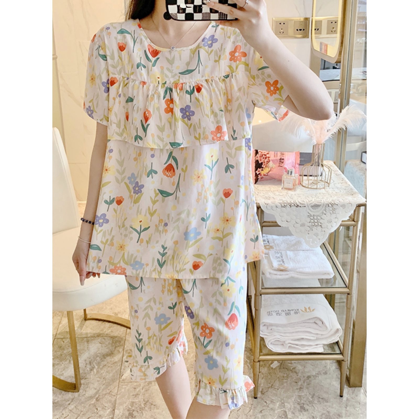 女性用アンチバンプパジャマ、夏用コットンシルク、夏用半袖パンツ、フリルスーツ、ホームウェア