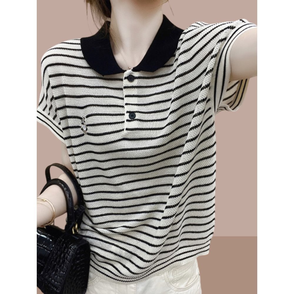 今年人気のアイスシルクストライプ半袖Tシャツレディース夏ウサギ刺繍コントラストボタンポロカラーセーター薄手