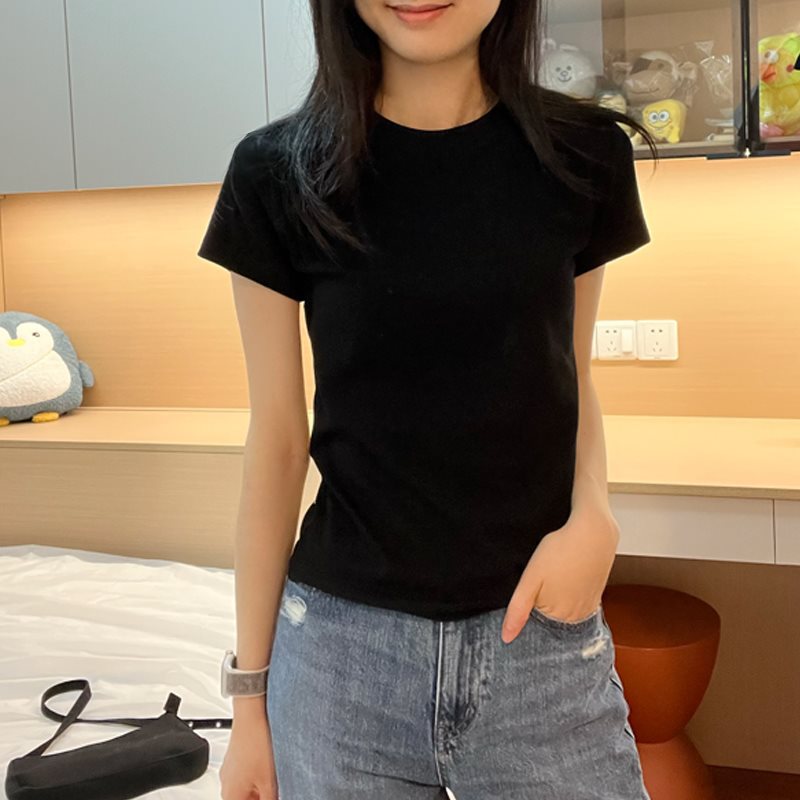ラウンドネック、右肩、スリムフィット、インナーとアウター用のボトムシャツ、2025夏用半袖トップ、コットン半袖Tシャツ、ブラック