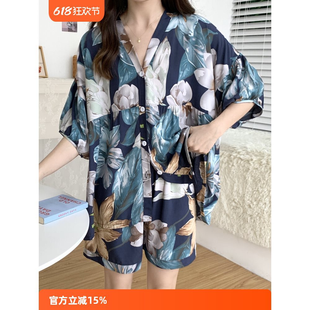 新しい夏の甘いパジャマ女の子スーツファットMM日本製半袖コットンシルクは屋外で着用可能人工綿ホーム服
