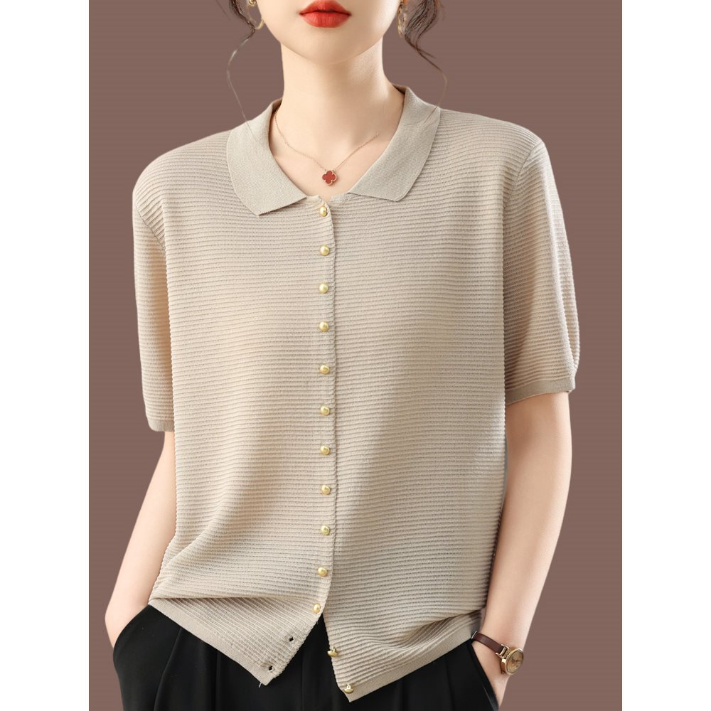 夏のマルベリーシルク半袖Tシャツレディーストップスゆったりおしゃれなポロカラーニットアイスシルク年齢軽減薄手スタイル女性用