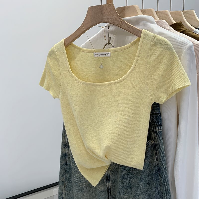ベーシックで万能なスクエアネック半袖セーター、女性用2025年夏新作、小柄な人向けショートショルダートップス