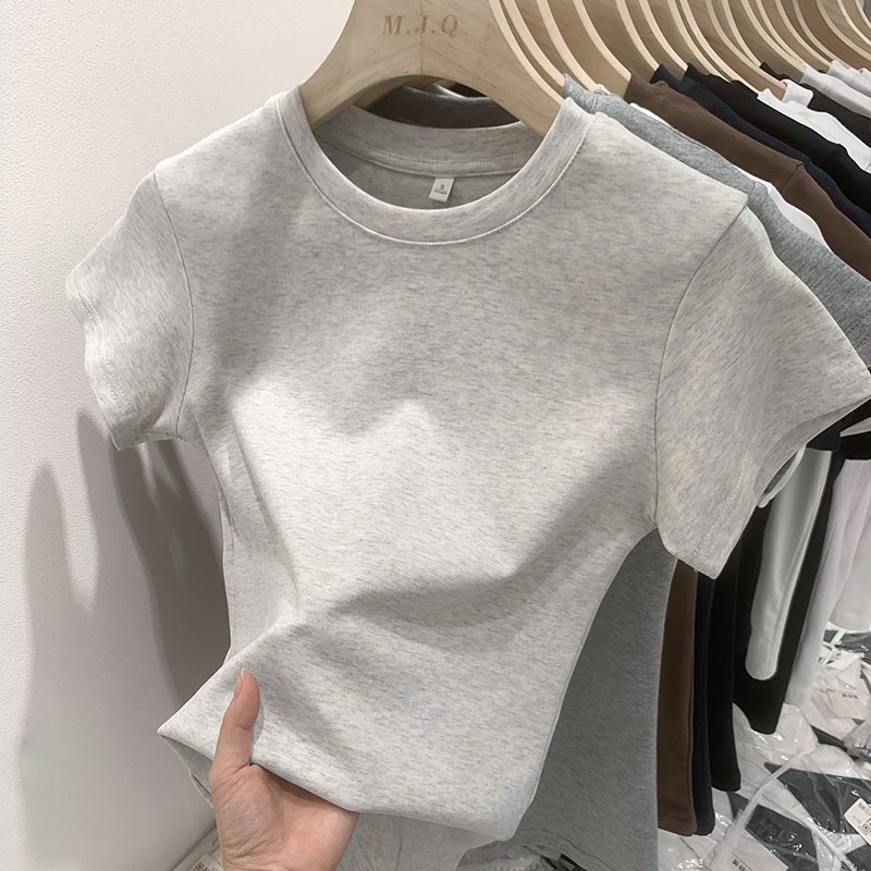 グレー半袖ショルダー Tシャツレディースコットン 2025 夏新作ラウンドネックスリムフィットベーシック Tシャツトップ