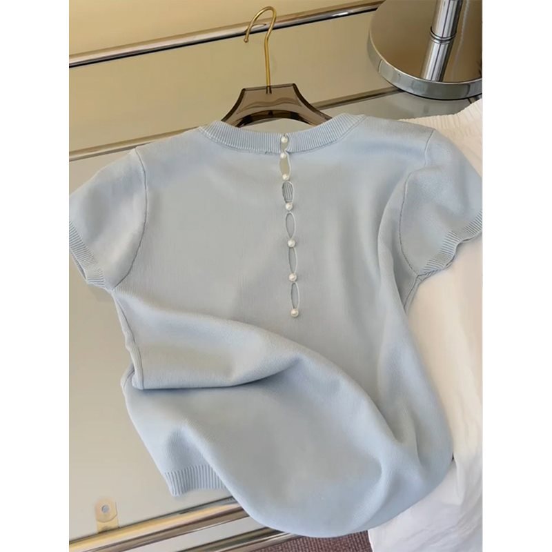 韓国ブルーアイスシルクニット半袖Tシャツレディース夏デザインバック中空スリムショートショルダートップ