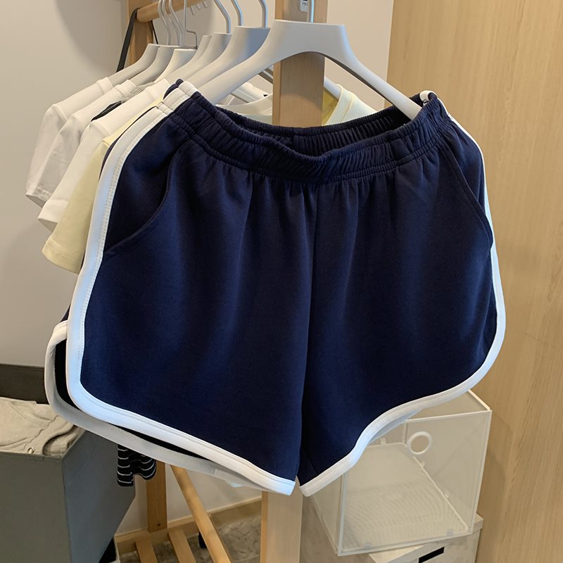 女性用ハイウエストスウェットパンツ、ショートAラインルーズワイドレッグパンツ、スリムな伸縮性ウエスト、コントラストカラーのネイビーブルーカジュアルパンツ
