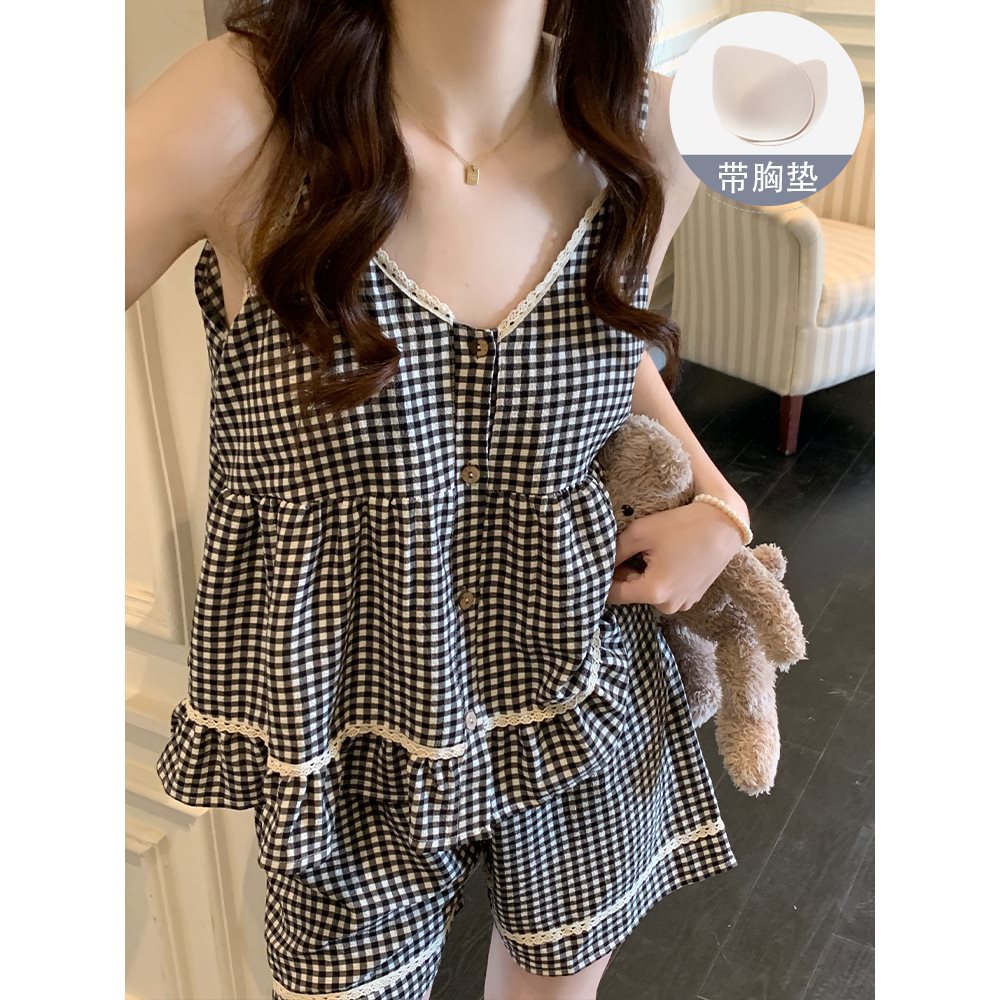 チェック柄レースサスペンダーパジャマ女性のための夏 2025 新しいセクシーな胸パッド付きホームウェア 2 点セット