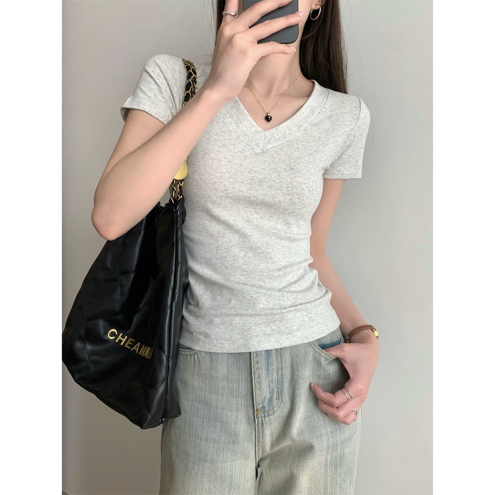 夏の新スタイルルーズでスリムなピュアグレーフロントショルダーTシャツレディースVネックコットン半袖ボトムシャツシンプルな半袖トップ