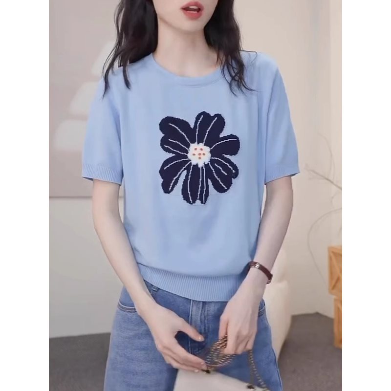 大きいサイズジャカードブルーニット半袖Tシャツ女性の夏ファットMMアイスシルク薄いTシャツルーズカジュアルラウンドネックトップ