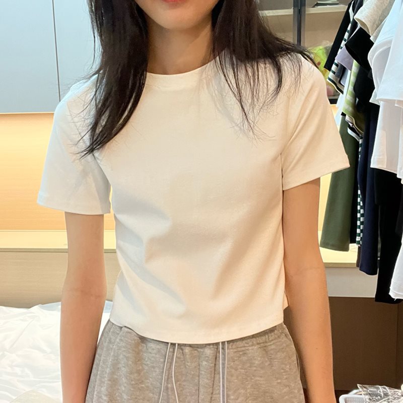春夏白ショートラウンドネックコットン半袖Tシャツレディーススリムフィット右肩ボトムTシャツホットガールショートトップトレンディ