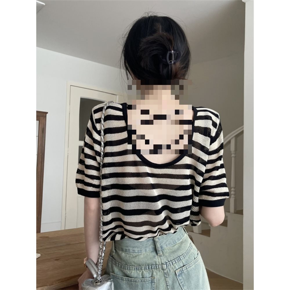 デザインストライプニット半袖Tシャツレディース夏アイスシルク日焼け止めブラウスシックなショートトップ