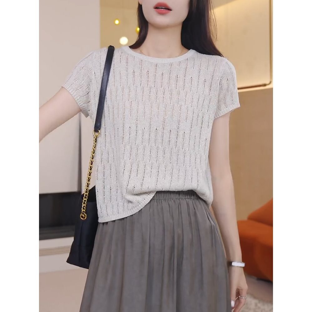 中空アイスシルク半袖セーター女性のための 2025 夏薄い新しいラウンドネック Tシャツカジュアル多用途ショートトップ