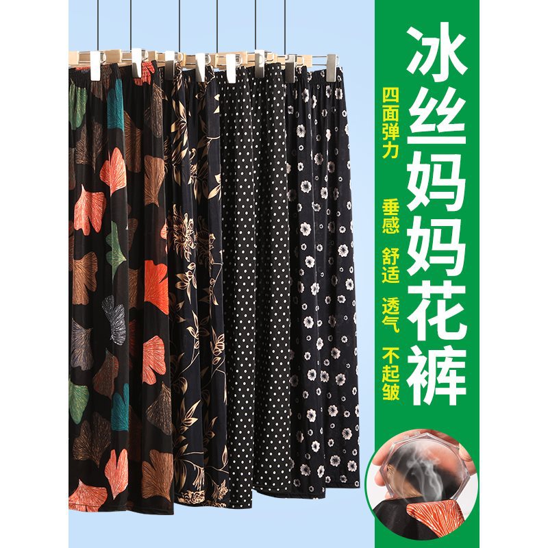 夏用薄氷シルクストレートワイドパンツ9点防蚊通気性おばさん中高年アウターフラワーパンツママ服