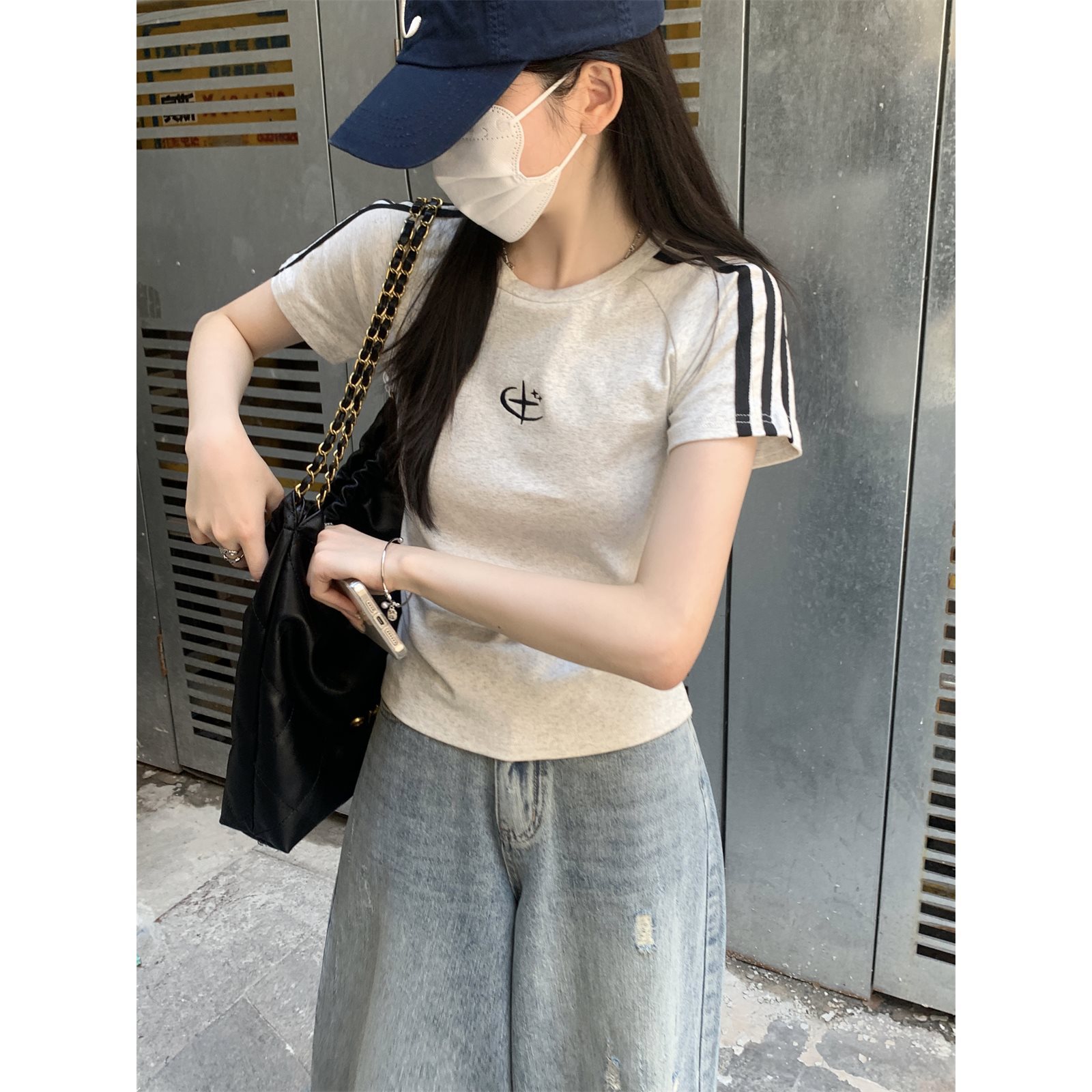 ホットガールカーブ不規則なVネックグレーショルダー半袖Tシャツ2025夏デザインウエストスリムショートトップ