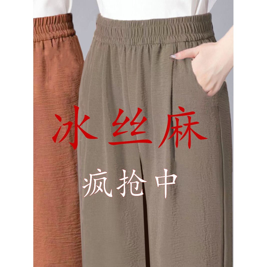 女性の新しいストレートパンツ無地アイスシルクリネン薄いハイウエスト女性のカジュアルパンツワイドレッグ中年9点パンツ夏