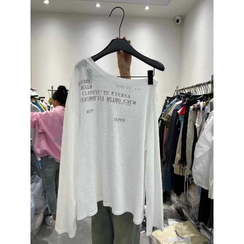 韓国 2025 新しい夏スタイルプリントレターレイジースタイル斜め襟オフショルダー長袖日焼け止めシャツ女性のルーズ Tシャツトレンディ