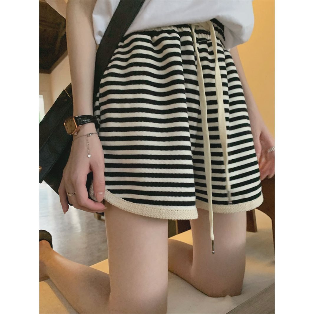 女性のためのカジュアルパンツ 2025 夏の新しいハイウエストルーズ学生スポーツ黒と白のストライプのワイドレッグショーツ小柄な人向け