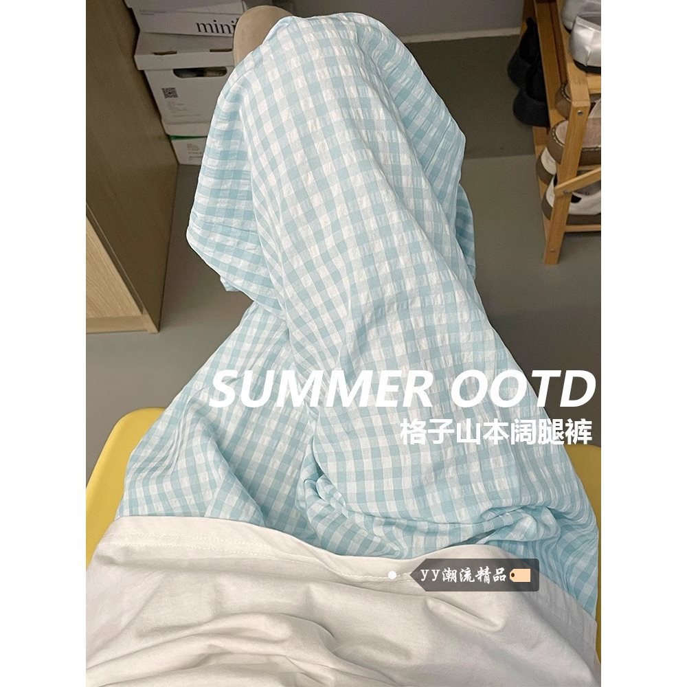 ブルーチェック柄ワイドレッグパンツレディースサマーパンツ薄手パジャマハイウエストストレートウォーキングパンツカジュアルアイスシルク山本パンツ