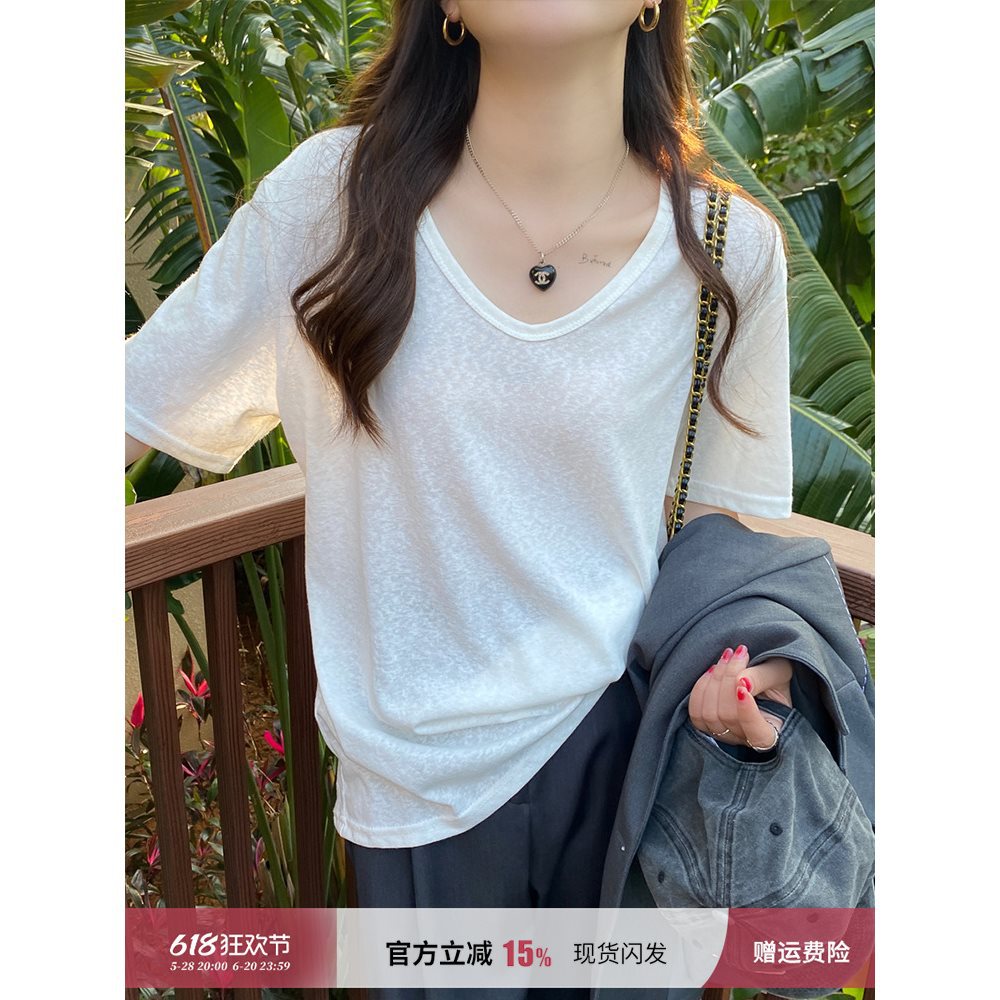 ホワイトコットンとリネンの半袖Tシャツレディース夏Vネックアイスシルクトップ薄手ルーズスリムショルダーTシャツ2025新スタイル